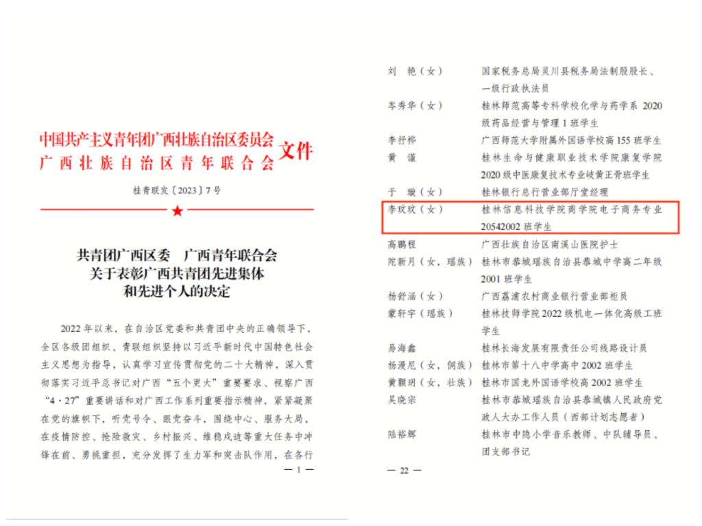 近日,共青团广西区委、共青团桂林市委相继印发了《共青团广西区委 广西青年联合会关于表彰广西共青团先进集体和先进个人的决定》、《关于表扬2022年度“桂林市五四红旗团委”“桂林市五四红旗团支部(总支)”“桂林市优秀共青团员”和“桂林市优秀共青团干部”的决定》,我校共计2个集体、7名个人光荣上榜。
