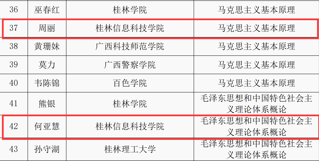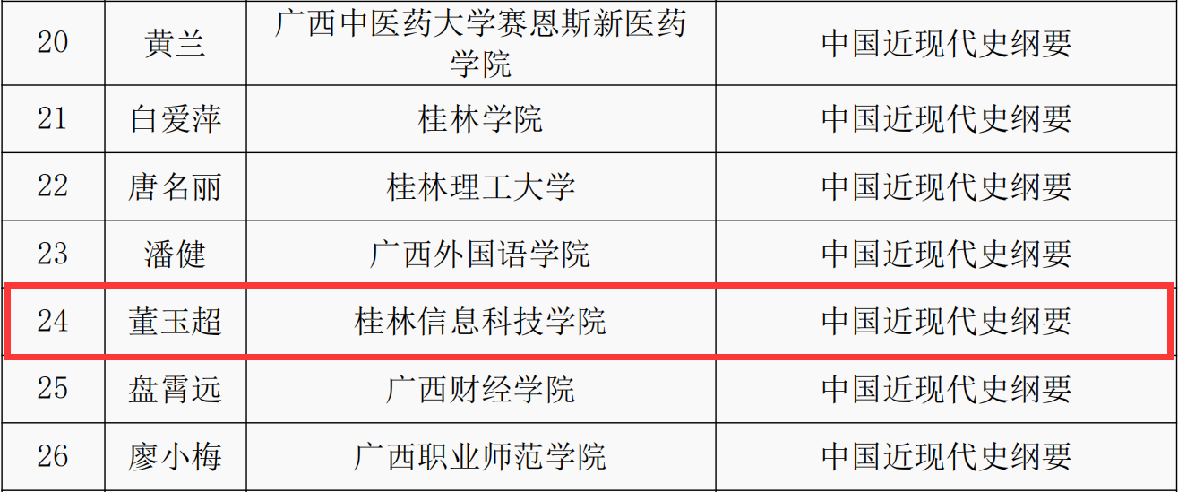 近日,自治区教育厅公布了2024 年广西高校思想政治理论课教师教学基本功比赛暨“精彩一课”评选活动的获奖名单,我校马克思主义学院教师何亚慧、周丽、董玉超表现出色,荣获三个二等奖。