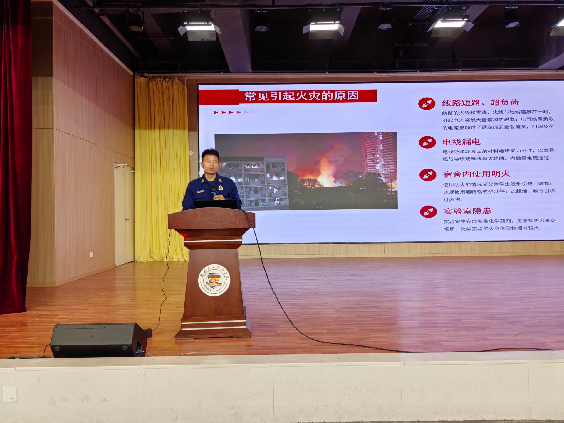在第33个全国消防日来临之际,为加强消防安全的宣传教育,进一步强化学校师生的消防安全意识,提升师生在火灾等突发事件中的自救自护能力,11月5日,学校联合临桂消防救援大队开展以“全民消防、生命至上”为主题的消防安全讲座和消防安全应急演练活动。学校900余师生员工参加本次活动。