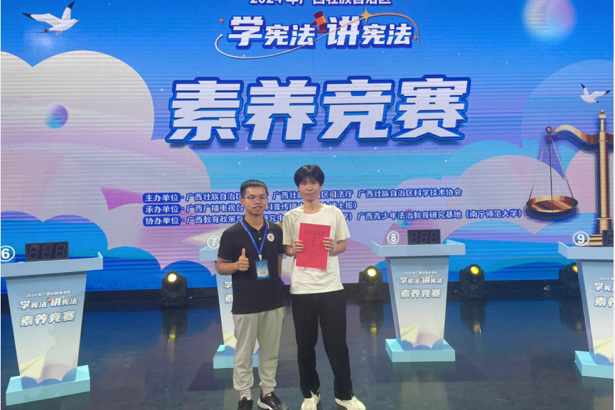 近日,2024年广西壮族自治区“学宪法 讲宪法”素养竞赛暨第九届全国学生“学宪法讲宪法”广西区赛决赛在广西广播电视台举行。来自我校机电工程学院2022级机械电子工程专业的尤朔同学,作为唯一选手代表学校与来自全区高校的66名选手同场竞技。