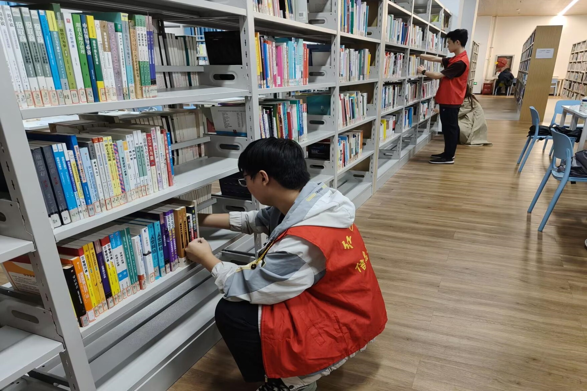 在整理图书的过程中,志愿者们整理图书入库、倒库、擦拭书架,认真完成每一项任务,展现了信科学子良好的团队合作精神和奉献精神。