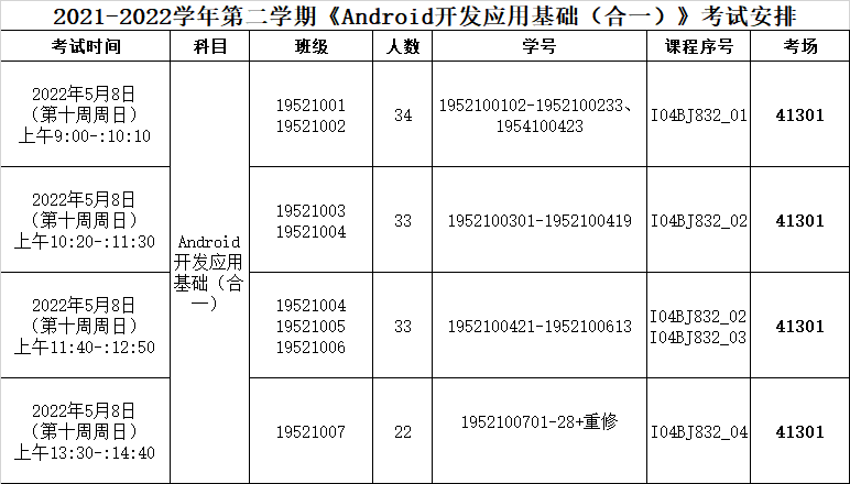 2021-2022学年第二学期《Android开发应用基础(合一)》考试安排