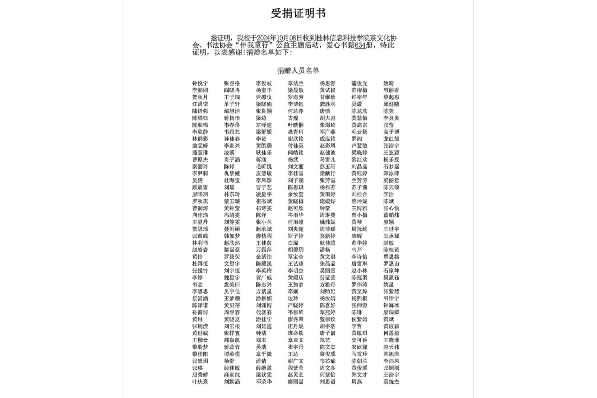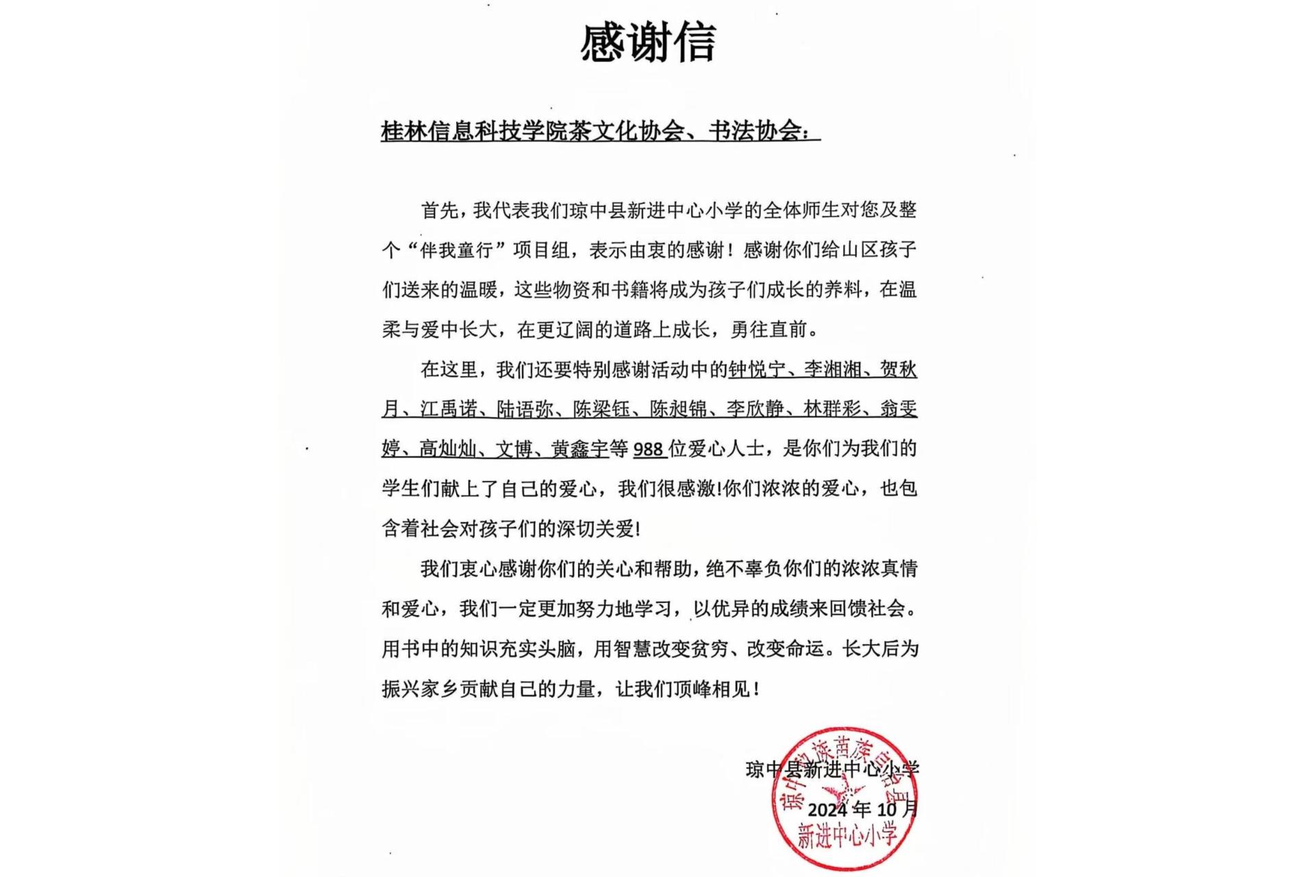 皇冠正规娱乐平台茶文化协会与书法协会在2024年9-10月联合举办的“童心关爱,共沐书香”的公益活动圆满落幕。此次活动旨在通过积攒爱心值为贫困小学的孩子们捐赠书籍、通过小程序为孩子们书写寄语,鼓励他们努力学习。近日,我校收到受捐学校琼中县新进中心小学感谢信、受捐证书以及孩子们的集体感谢视频。